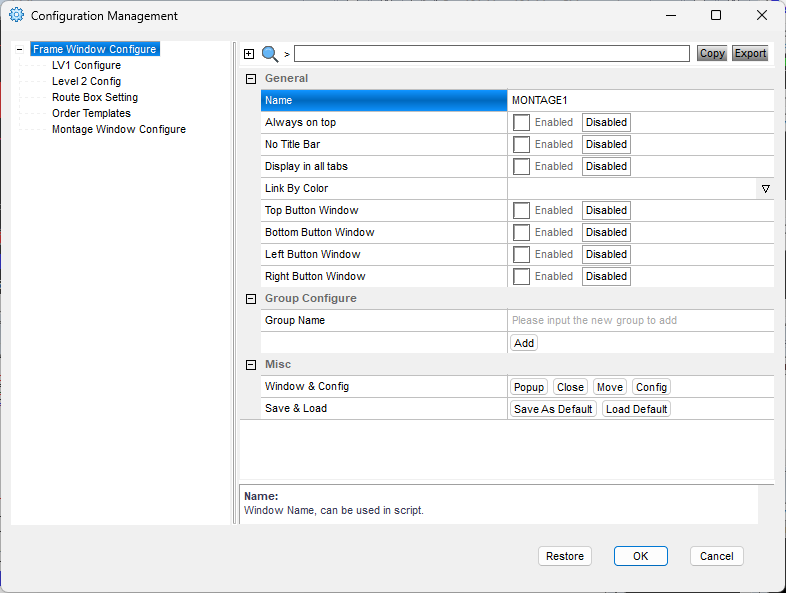 For example, I name my chart windows as MY1MIN, MY5MIN, MY60MIN, MYDAILY etc. while the montage window is named MONTAGE1